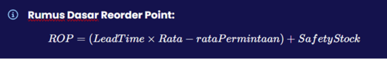 Reorder Point adalah tingkat persediaan minimum di mana bisnis harus melakukan pemesanan ulang produk untuk menghindari kehabisan stok. Konsep ini sangat penting dalam manajemen rantai pasok karena menentukan kapan tepatnya harus melakukan pemesanan baru sebelum persediaan yang ada habis.